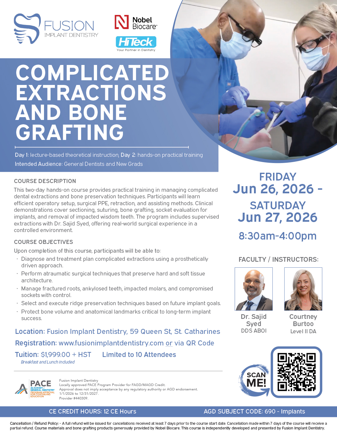 This two-day hands-on course covers complex extractions and bone preservation techniques, including operatory setup, surgical protocols, retraction, and proper assisting. Participants will observe clinical demonstrations—sectioning, suturing, bone grafting, socket evaluation, and impacted wisdom tooth removal—and complete supervised extractions with Dr. Sajid Syed for real-world surgical experience.