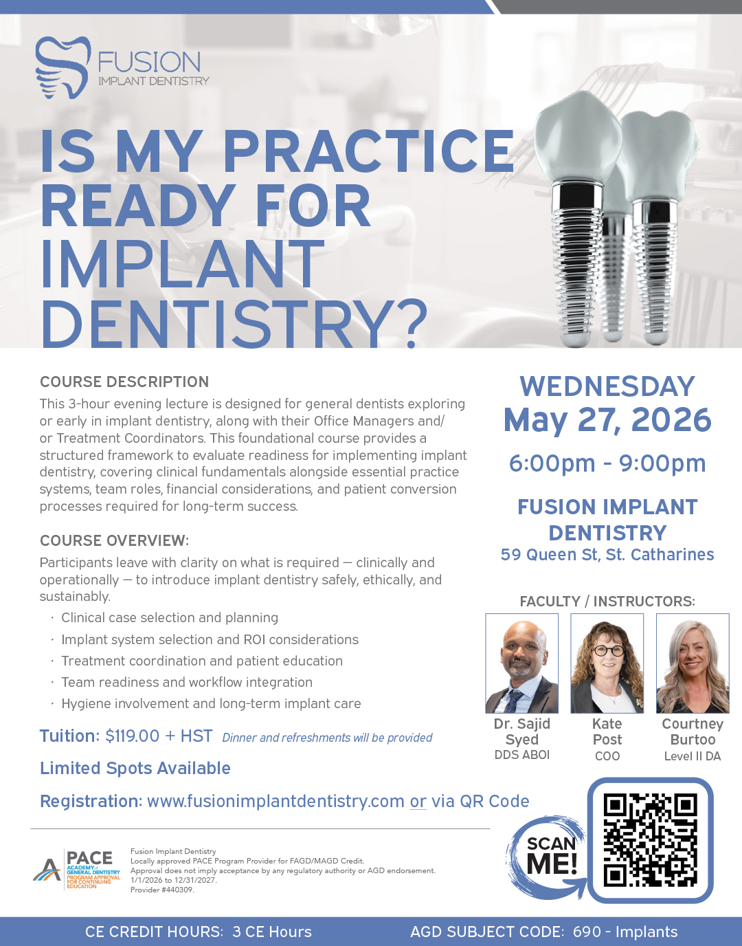 Fusion Implant Dentistry is a locally approved PACE Program Provider for FAGD/MAGD Credit. Approval does not imply acceptance by any regulatory authority or AGD endorsement. 1/1/2026 to 12/31/2027. Provider #440309.